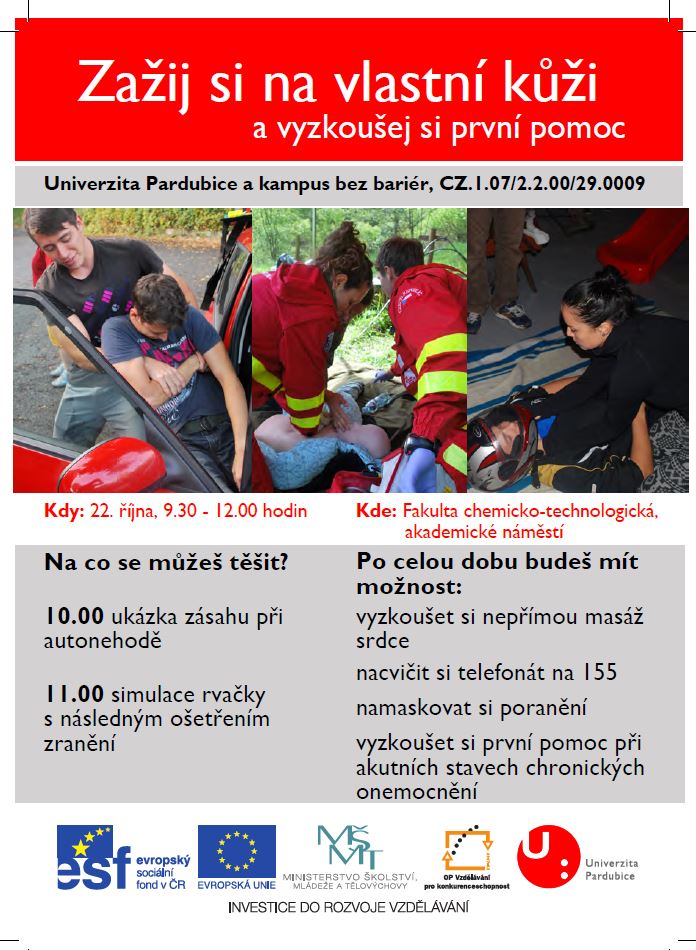 Na šesti stanovištích si zájemci budou moci vyzkoušet např. resuscitaci, maskování poranění nebo simulaci komunikace s dispečinkem záchranky. Ve dvou hlavních výstupech v 10 a v 11 hodin bude předvedeno poskytování první pomoci zraněným při šarvátce a autonehodě. Akce se koná v rámci projektu Univerzita Pardubice a kampus bez bariér, ve spolupráci se studenty oboru Záchranář z Fakulty Zdravotnických studií, pod odborným vedením Mgr. Jindry Holekové.