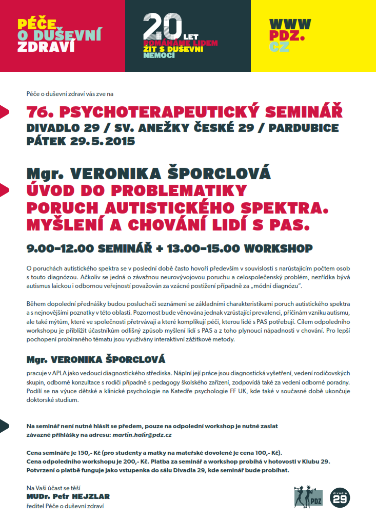 Během dopolední přednášky budou posluchači seznámeni se základními charakteristikami poruch autistického spektra