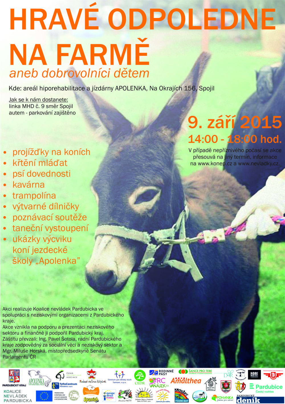 Událost, kterou pořádá Koalice nevládek Pardubicka a sdružení Apolenka – hiporehabilitace za podpory Pardubického kraje, startuje v 14:00, zábava potrvá až do 18:00. Areál Apolenky se nachází ve Spojile, v těsném sousedství Pardubic. Autobus MHD č. 9 zastaví přímo před bránou farmy. Na programu dne budou také taneční vystoupení žáků školy SVÍTÁNÍ, pardubických cheerleaders nebo břišních tanečnic. Mezitím co budou děti dovádět na trampolíně, malovat nebo hrát poznávací soutěže, si mohou dospělí zpříjemnit den posezením v místní kavárně.
