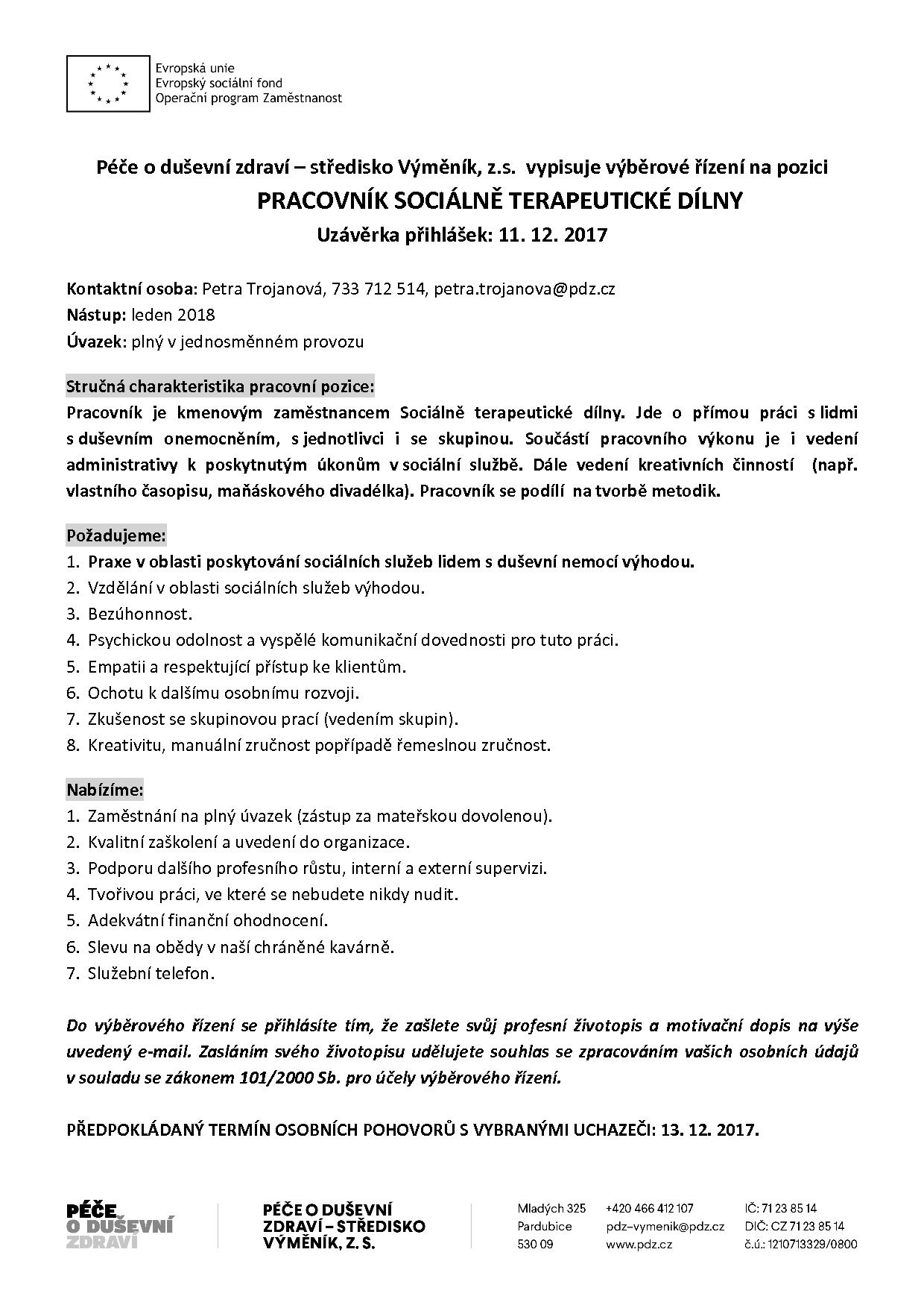 Hledáme pracovníka/pracovnici do naší Sociálně terapeutické dílny (vzdělání v sociální oblasti není podmínkou)