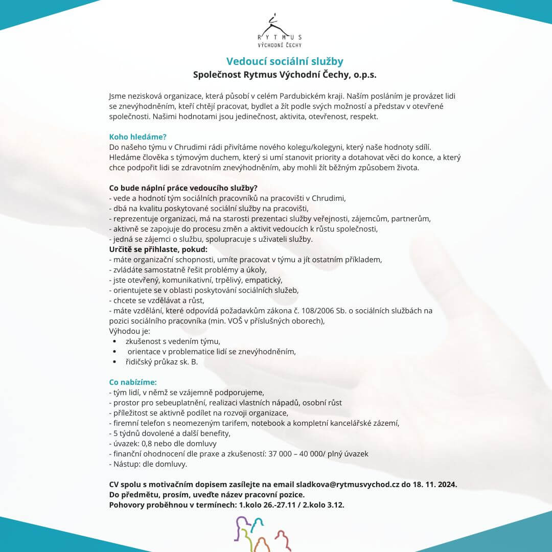 Společnost Rytmus Východní Čechy, o.p.s. hledá kolegu/kolegyni na pozici Vedoucí sociální služby. Více v inzerátu dole: