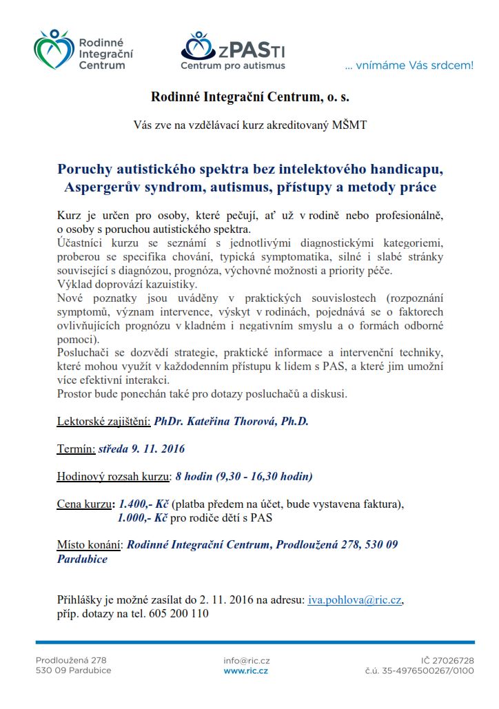 Cena kurzu: 1.400,- Kč (platba předem na účet, bude vystavena faktura), 1.000,- Kč pro rodiče dětí s PAS