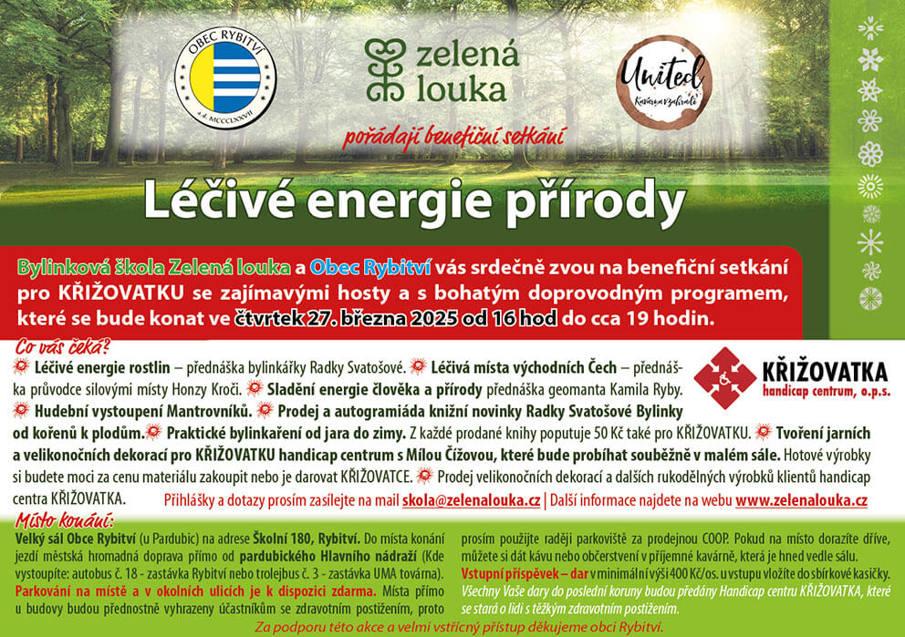 Bylinková škola Zelená louka a Obec Rybitví vás srdečně zvou na benefiční setkání pro KŘIŽOVATKU se zajímavými hosty a s bohatým doprovodným programem, které se bude konat ve čtvrtek 27. března 2025 od 16 do cca 19 hodin.