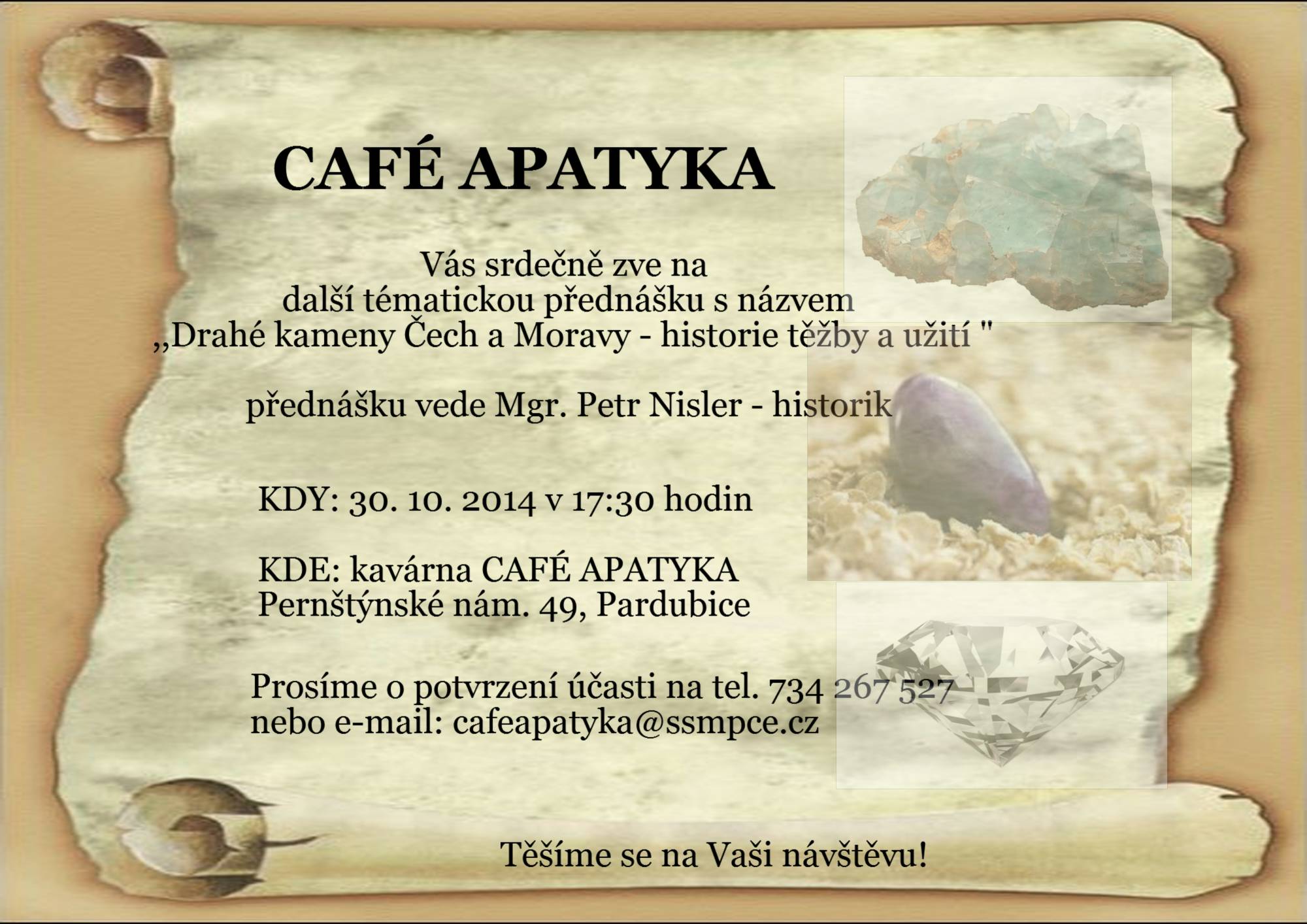 Prosíme o potvrzení účasti na tel. 734 267 527 nebo e-mail: cafeapatyka@ssmpce.cz